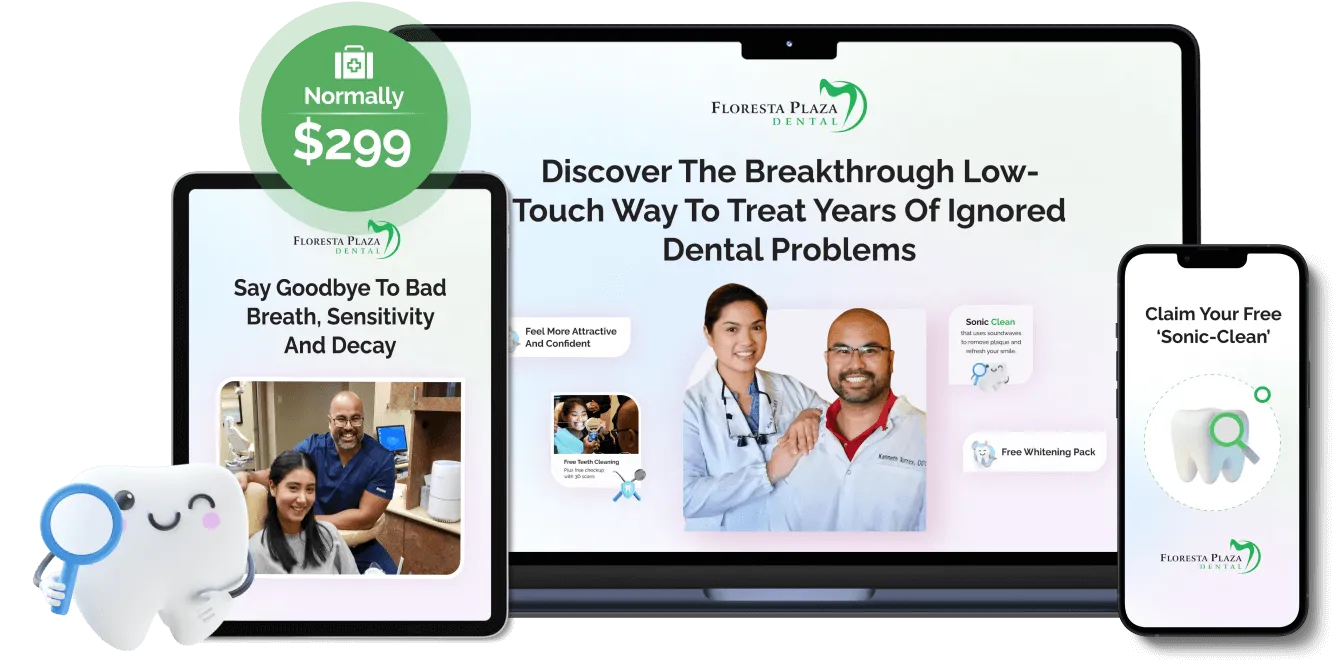 For a limited time, Floresta Plaza Dental is offering a ‘Sonic Clean’ and check-up with one of our highly-experienced dentists – free of charge!* We’ll use an ultrasonic scaler that combines high-frequency vibrations with an antibacterial solution to remove plaque, tartar, and stains from the tooth’s surface and below the gum line. The result? A brighter smile, healthier gums, less discomfort and 33% less time in the chair!